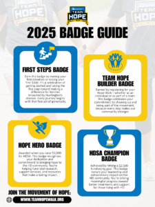 See the badges you can earn as you fundraise for the Team Hope Walk! This quick guide explains each level and how to unlock them—perfect for keeping your team motivated and on track.