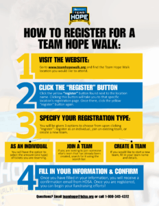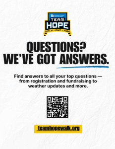 Download this handy flyer for quick answers to common questions about the Team Hope Walk. It covers everything from registration and fundraising tips to event-day details—perfect for sharing with friends, family, or teammates who want to learn more.