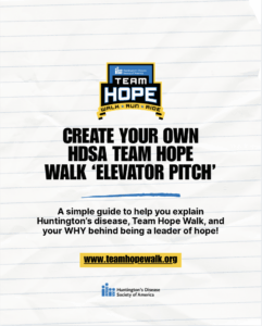 Download this quick guide to craft a compelling elevator pitch for your HDSA Team Hope Walk. It gives you a simple framework and examples you can customize—perfect for sparking interest with potential donors, partners, and volunteers.
